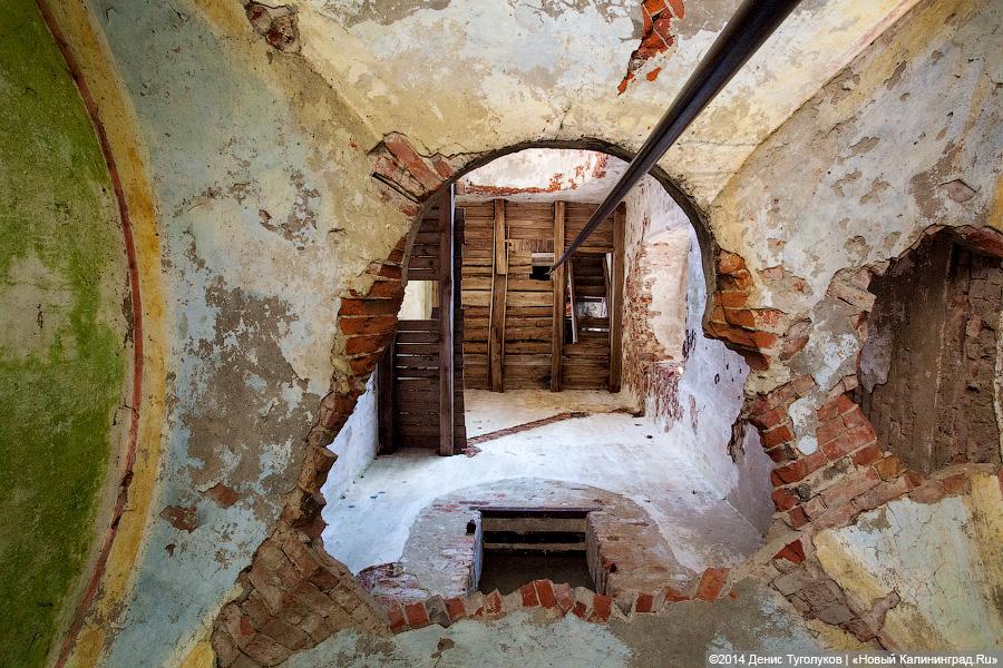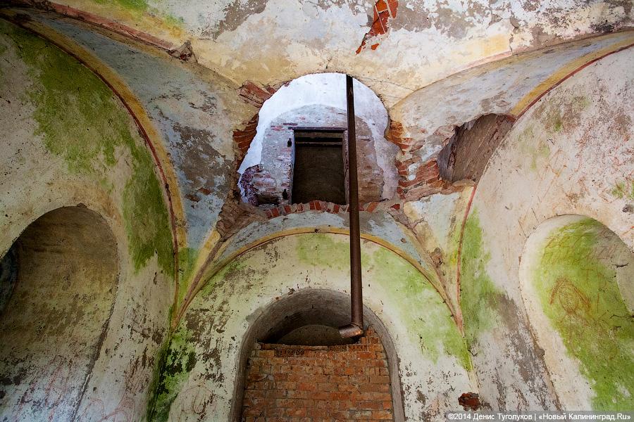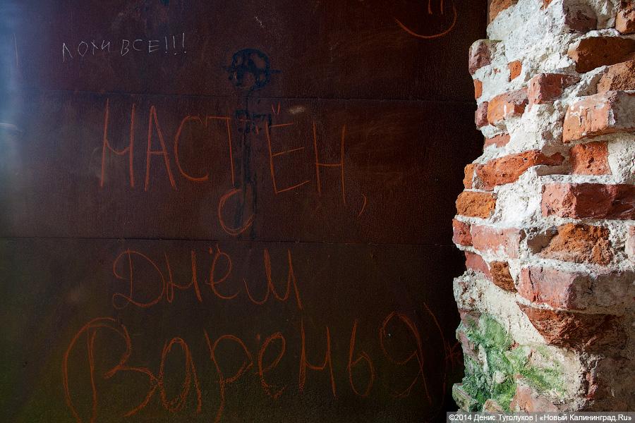 Внутри ситуация еще более удручающая: пол внушительного помещения усыпан разнообразным мусором, а стены исписаны совсем не религиозными изображениями и фразами, самые безобидные из которых — признания в чувствах и всяческие поздравления. По периметру вовсю разрослась плесень разнообразных оттенков зеленого цвета. А стойкий запах сырости не развеивается даже порывами теплого весеннего ветерка. У основания шпиля башни, как гласят предания уже советского времени на этой земле, находится снаряд, попавший в церковь, но не разорвавшийся, а продолжающий до сих пор оставаться в том месте, куда попал во время бомбардировки.