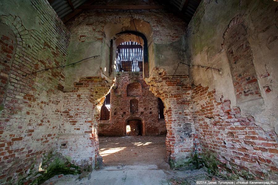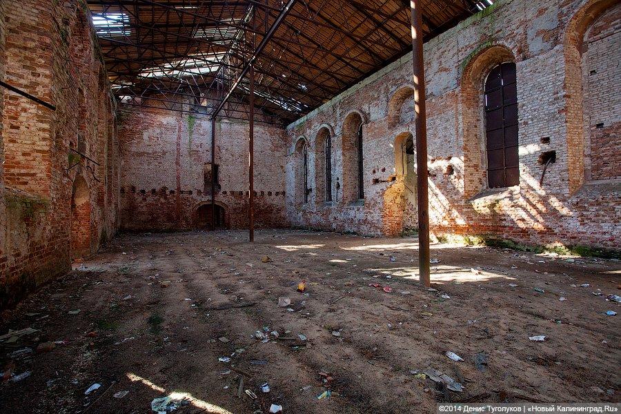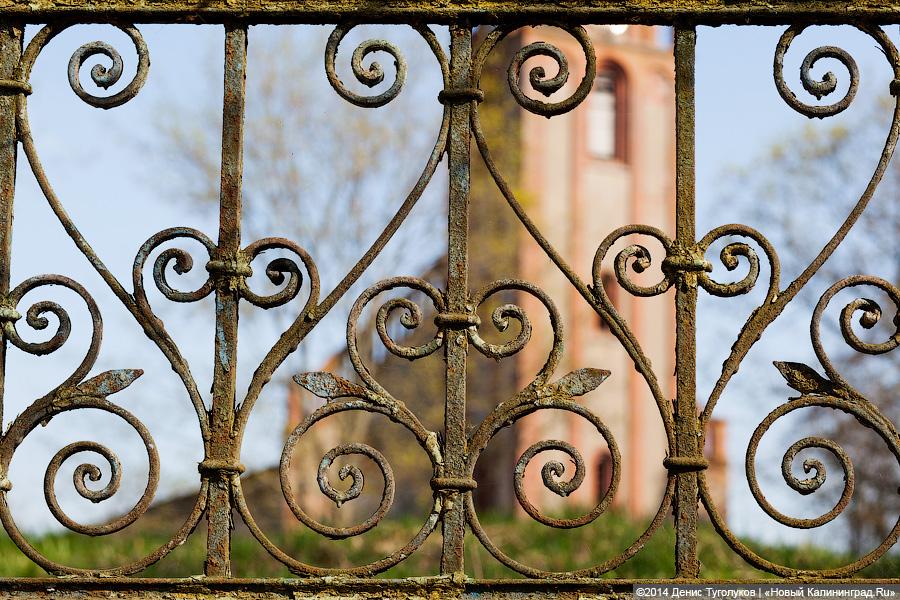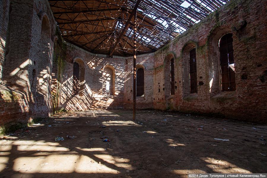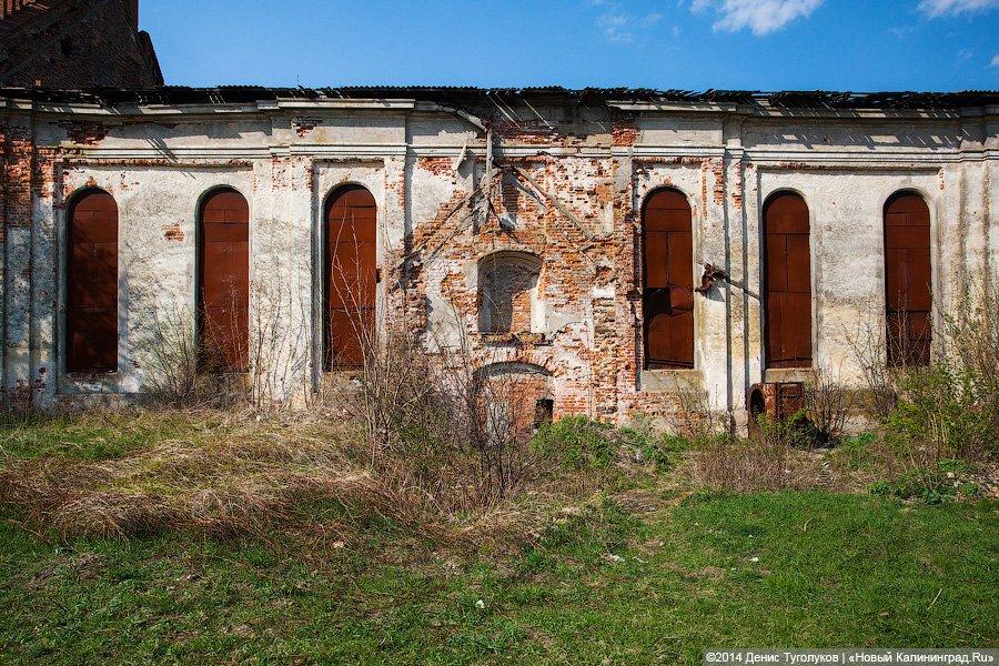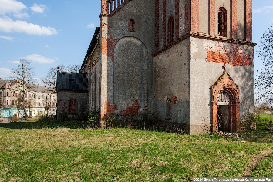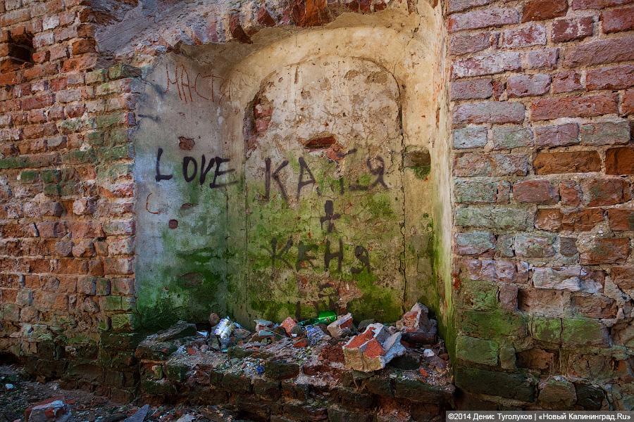 Вокруг кирхи — заросли кустарника, мусор и остатки кирпичной ограды.