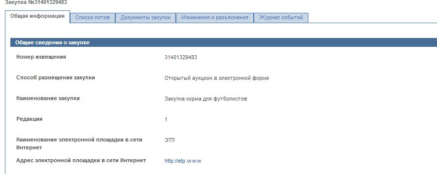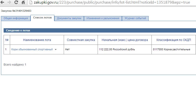 В сведениях о закупке говорится, что проводится она посредством открытого электронного аукциона. Начальная цена — 112,2 тысячи рублей. Всего компании требовался 1 центнер «корма спортивного обыкновенного», относящегося по классификации к кормам растительным. При этом подробной документации на портале не размещено, файл содержит одно только сообщение «test».