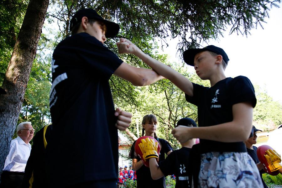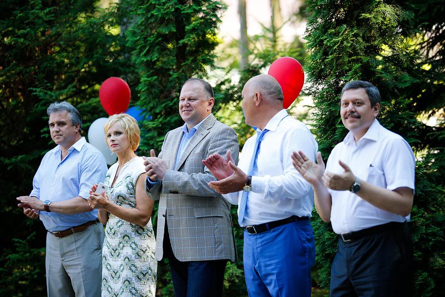 В это время на главной дорожке появляется правительственная делегация во главе с губернатором. Все выстраиваются на крохотной площадке в центре лагеря, в центре которой высится флагшток. За бюстом Героя Советского Союза Юрия Смирнова прячутся взволнованные девчушки в ярких платьях — как позже выяснилось, это участницы ансамбля «Ляльки» из Екатеринбурга. Им открывать концертную часть программы.