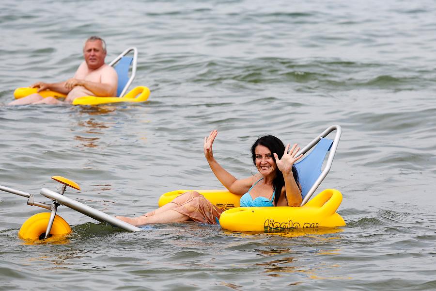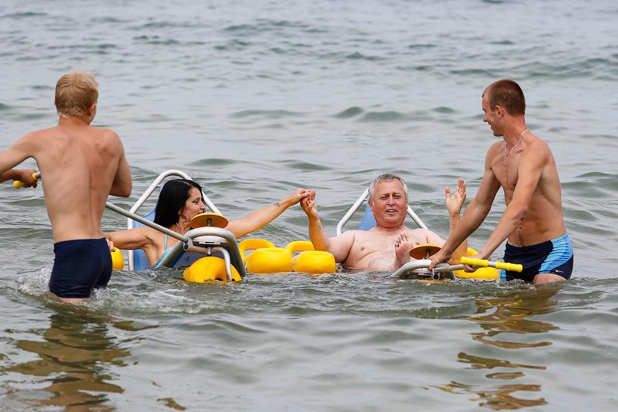 Когда все приготовления были завершены, председатель «Ковчега» предложил инвалидам протестировать коляски. Первыми искупаться решили калининградка Марина Куликова и гость региона — житель Пскова Федор Постнов. Переоделись колясочники в достаточно удобной раздевалке, а спустя несколько минут уже пересели в плавательную коляску. В этом им помогли волонтеры.