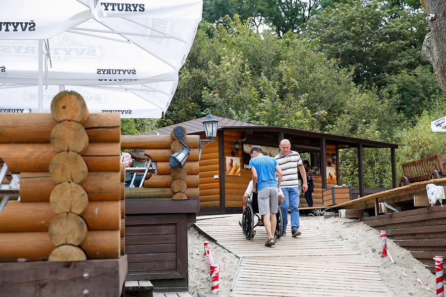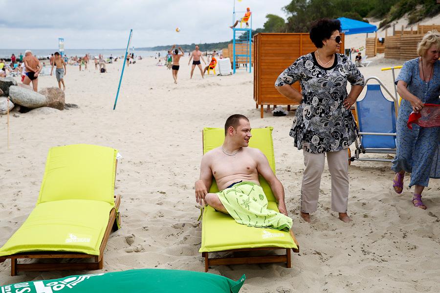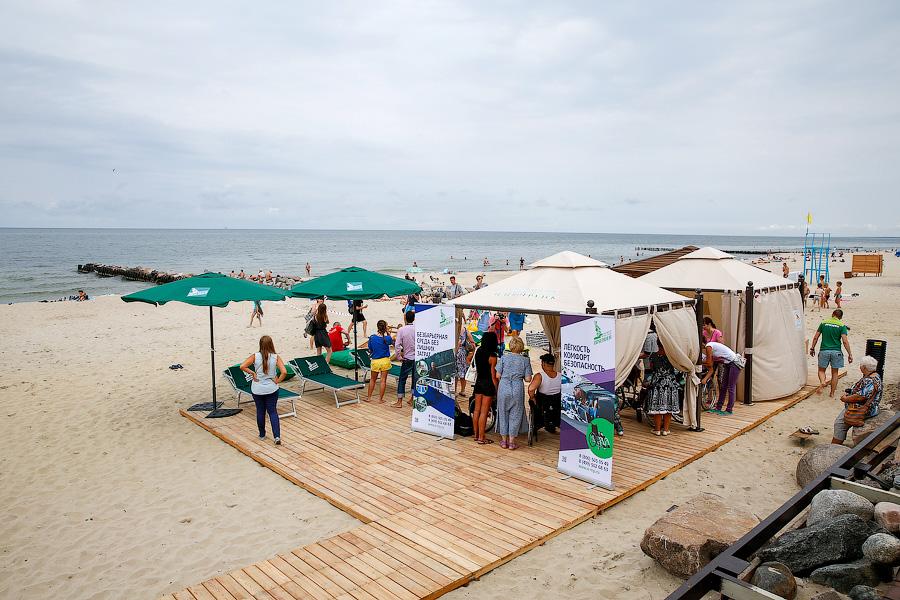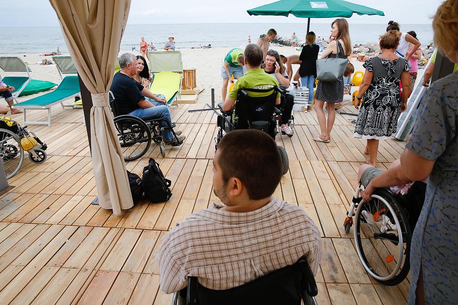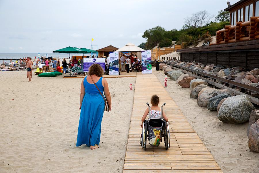 На пляже в Зеленоградске в четверг было как никогда много людей в инвалидных креслах. По пути к месту встречи на променаде взамен пандусов под углом 45 градусов можно было заметить новенькие, с углом уклона в 6 градусов. Всего их установили два: один — у гостиницы «Самбия», другой — с обратной стороны, у съезда к морю.
