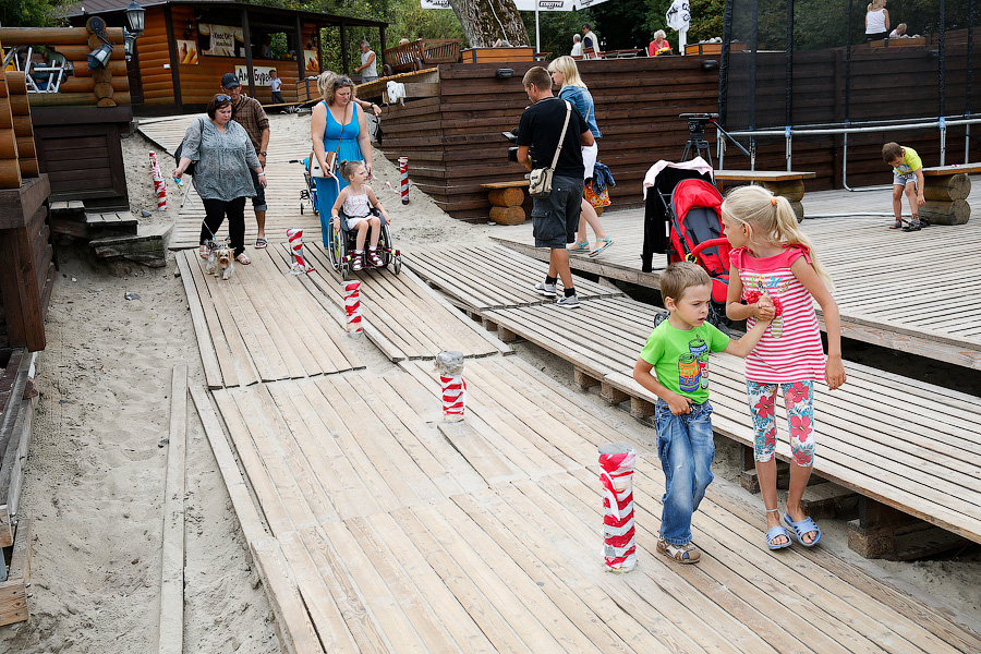 К слову, длинный пандус у моря рабочие в 12 дня еще доделывали. Чуть дальше был уложен свежий деревянный настил для беспрепятственного доступа колясочников на площадку с лежаками. Однако по нему, как выяснилось, передвигались в этот день не только инвалиды, но и другие отдыхающие. Туристы — кто-то с собаками, кто-то с маленькими детьми — прогуливались по новой дорожке, не задумываясь о том, что настил предназначен вовсе не для них.