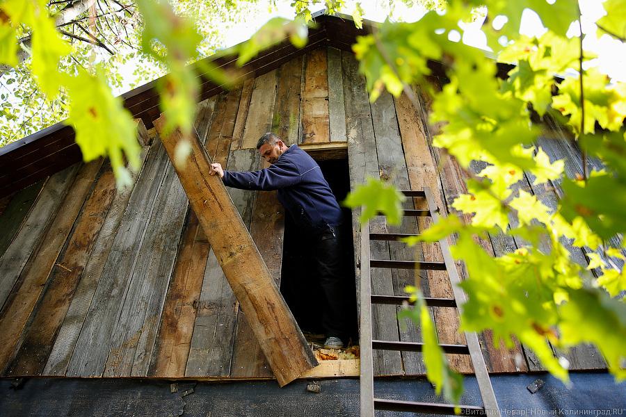 Однако оказалось, что дыру уже заделали — забили досками. По словам местного жителя Анатолия Колпакова, сделать это местные власти умудрились за один день. «Но под досками балки гнилые!» — заявил местный житель, залез на чердак и принялся выбивать одну из досок, чтобы подтвердить свои слова.