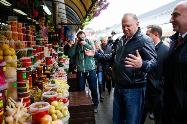 Пока внушительная делегация СМИ и чиновников в ожидании губернатора томилась в мясном павильоне, некоторые продавцы возмущались, что им мешают торговать. А один язвительный покупатель пенсионного возраста подначивал собравшихся комментариями о том, что «только музыки не хватает». Министр промышленности Дмитрий Чемакин прятался от дождя под козырьком входа, где исполнял роль привратника. Он вежливо открывал двери перед женщинами с внушительными сумками, но покупательницы его даже не узнавали.