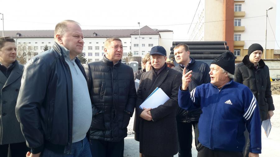 Не успел губернатор ступить на неровную строительную поверхность и начать разговоры с подрядчиками, как к нему пробился старичок в вытянутых трениках и