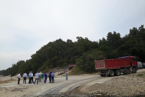 К месту строительства ведет бывшая «ослиная тропа», протоптанная отдыхающими. А ныне «временная дорога для подвоза строительных и инертных материалов», рассказала, спускаясь по бетонным плитам, министр развития инфраструктуры Елена Дятлова. Именно по этой дороге к пляжу, где прогуливаются около десятка отдыхающих, весь день свозят песок и стройматериалы грузовики.