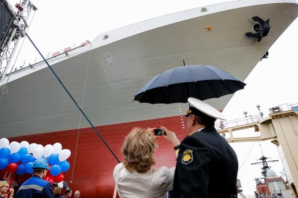 «Адмирал Макаров», тем временем, медленно движется к воде на доковых тележках. «Сейчас он спустится на воду, его возьмут два буксира, затянут в док, док погрузится, он будет на воде. А потом док всплывет, а корабль окажется в доке», — поясняют специалисты. Спуск на воду вовсе не означает, что «Адмирал» готов к труду и обороне. Просто дальше его будут достраивать уже на воде.