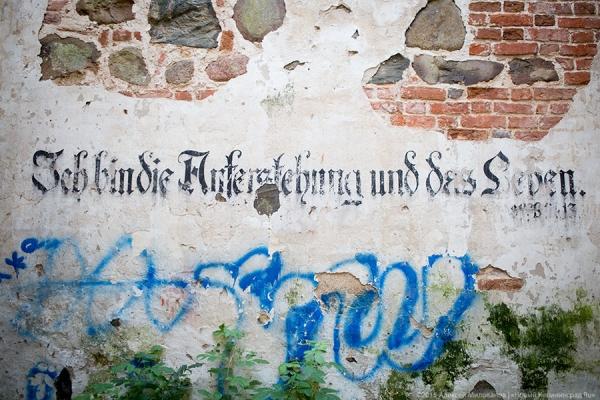 Однако поисками вандалов владелец руин в лице калининградской епархии РПЦ не озаботился. Хотя неведомый автор украсил своими шедеврами и уголок, где подпертый кирпичами стоит православный крест — единственный признак того, что 5 лет назад памятник сменил собственника. Только вот посетители объекта, по всей видимости, не испытывают священного трепета ни перед руинами лютеранской кирхи, ни перед символом православия. И если в стенах памятника распивается спиртное, то у креста не гнушаются и мусор свалить.
