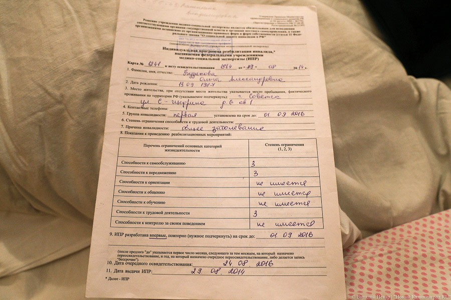 При выписке в индивидуальной программе реабилитации инвалидов (ИПР) медики указали, что Ольга ни в чем не нуждается. Ни в санаторном лечении, ни в средствах реабилитации. «Как растение. Полил — значит будет жить, не полил — значит не будет. Врач сказал: зачем ей коляска, если она не жилец. Ей никакая коляска не нужна», — рассказала она.