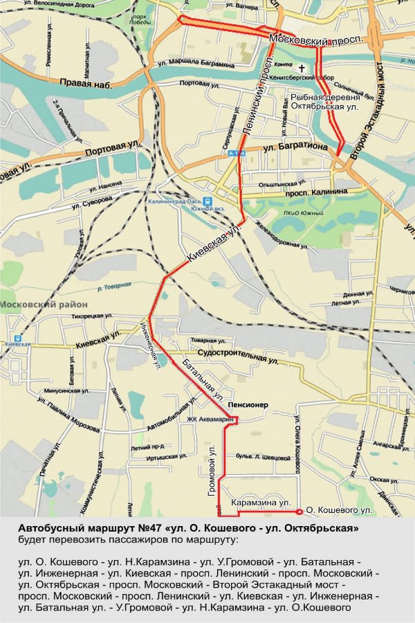 Автобус № 47 «ул. О. Кошевого — ул. Октябрьская» будет следовать по улицам Кошевого, Николая Карамзина, Ульяны Громовой, Батальной, Инженерной, Киевской, а далее по Ленинскому и Московскому проспектам, улице Октябрьской, в обратном направлении — по тому же маршруту.