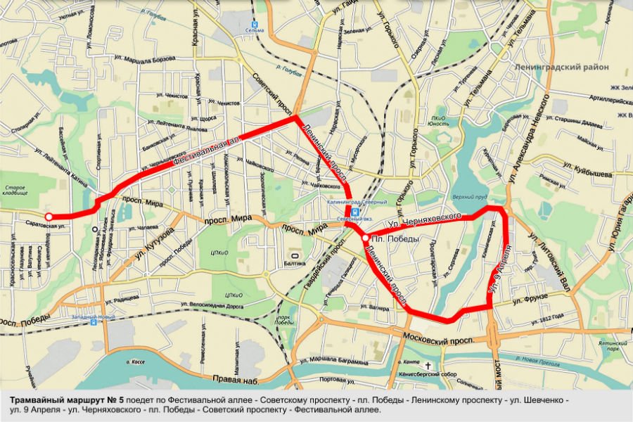Трамвайный маршрут № 5 поедет по Фестивальной аллее, Советскому проспекту, площади Победы, Ленинскому проспекту, улицам Шевченко, 9 Апреля, Черняховского, вернется на площадь Победы и дальше поедет по Советскому проспекту на Фестивальную аллеею.