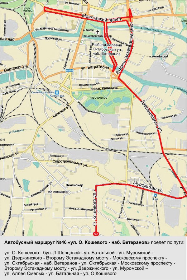 Маршрут № 46 будет соединять улицу Олега Кошевого с набережной Ветеранов. Он поедет по Кошевого, бульвару Любови Шевцовой, улицам Батальной, Муромской, Дзержинского, второму эстакадному мосту, Московскому проспекту и улице Октябрьской. В обратном направлении автобус № 46 пойдет по Октябрьской, Московскому проспекту, второй эстакаде, улицам Дзержинского, Муромской, Аллее Смелых, Батальной на улицу Олега Кошевого.