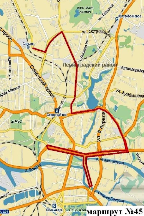 Автобусный маршрут № 45 «ГУР „Сельма“ — набережная Ветеранов» будет ходить по улице Генерала Челнокова, улицам Согласия, Гайдара, Горького, Черняховского, Литовскому валу, Московскому проспекту, улице Октябрьской, в обратном направлении — по тому же маршруту.