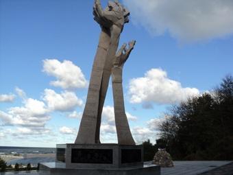 По словам публицистки Лизы Шэфер из Германии, представляющей автора памятника скульптора Франка Майслера, мемориал жертвам Холокоста в Янтарном в виде воздетых к небу рук символизирует последнюю попытку женщин, погибших в 1945 году на этом месте, ухватиться за жизнь. Она отметила, что все номера, выгравированные на монументе, реально существующие номера заключенных концлагерей.