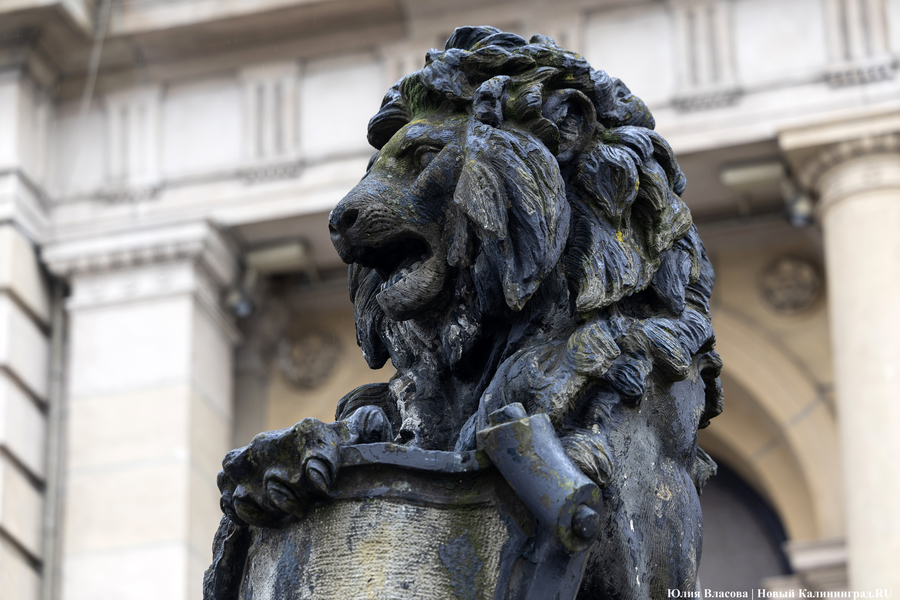 Парадный вход был фланкирован двумя фигурами (также созданными Хундризером) «геральдических» львов-щитодержателей. Один из них придерживал лапой герб корпорации купечества Кёнигсберга (большой парусник на волнах с литерами КК), второй — гербовые изображения трех самостоятельных городов — Альтштадта, Кнайпхофа и Лёбенихта, объединенных в 1724 году в Кёнигсберг. Образ льва со щитом в лапах восходит к одной из самых известных работ итальянского скульптора Донателло. Его Мардзокко — символ Флоренции эпохи Возрождения. Гербы со щитов у львов исчезли в период активной реконструкции здания в 1960-х годах. На фотографиях 1964−1965 годов львы еще стоят с гербами. Их просто стесали, потому что это была символика, непонятная в то время.