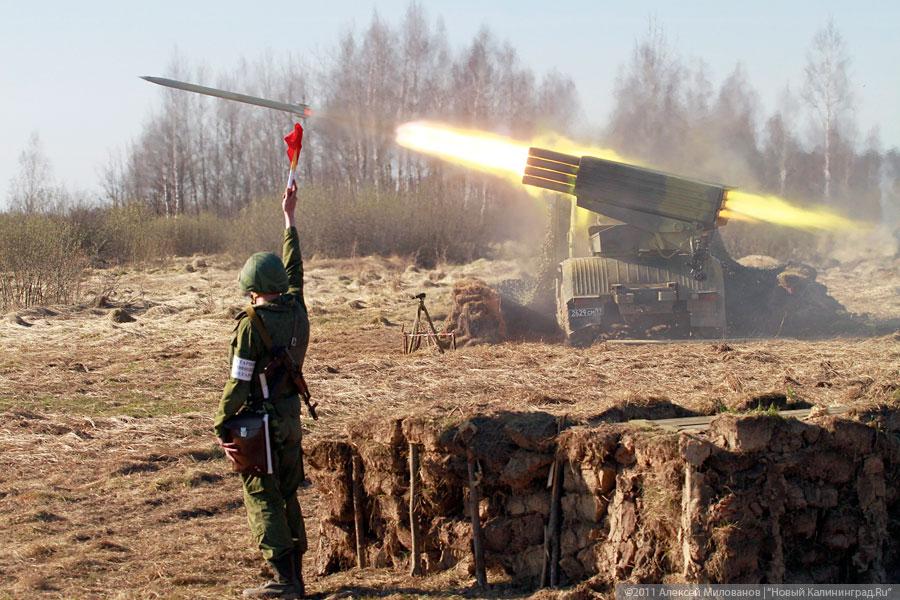 19 апреля 2011 года. Реактивная система залпового огня РСЗО 9К51 "Град" на боевых стрельбах на полигоне Павенково в ходе полевого выхода ракетных войск и артиллерии береговых войск Балтийского флота.