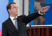 18 мая 2011 года. Президент РФ Дмитрий Медведев во время большой пресс-конференции в подмосковной бизнес-школе "Сколково".