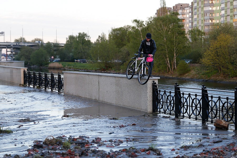 11 мая 2017. Калининградец пытается перебраться через затопленную в результате прорыва водопровода набережную Трибуца.