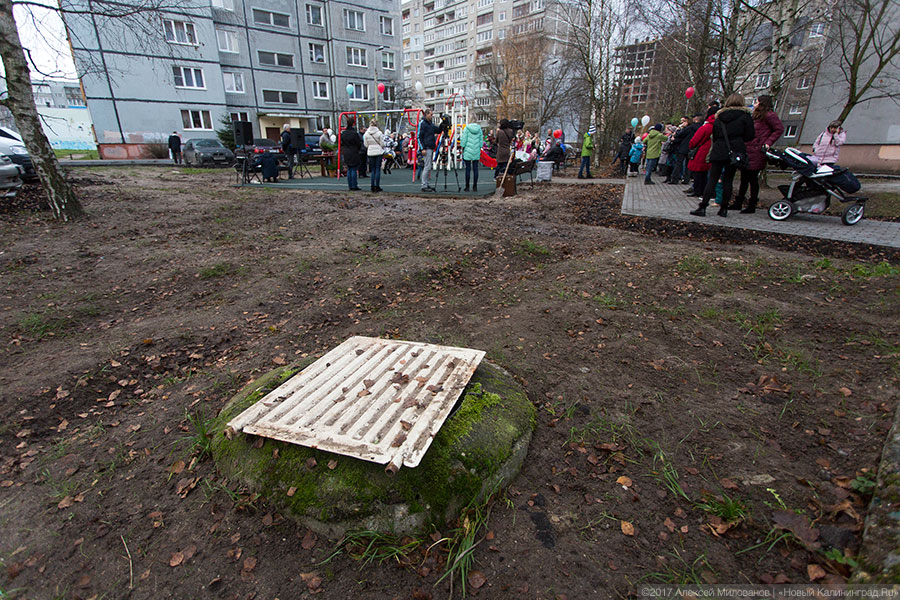В субботу в Калининграде продолжилась череда праздников «Мой двор». Они должны показать местным жителям, как власть заботится о горожанах. Например, «благоустраивает» их дворы по федеральной программе. Ставит скамейки и детские площадки — пусть и прямо в грязь, стыдливо прикрывая чем попало расположенные рядом люки канализации.