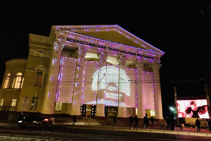 В воскресенье, 10 ноября, в рамках Всероссийского театрального марафона колоннада драмтеатра превратилась в огромный экран, а сценической площадкой ненадолго стала территория перед зданием. Для приглашенных шоу продолжилось внутри театра, где прошла торжественная церемония передачи символа марафона Калининградской области.