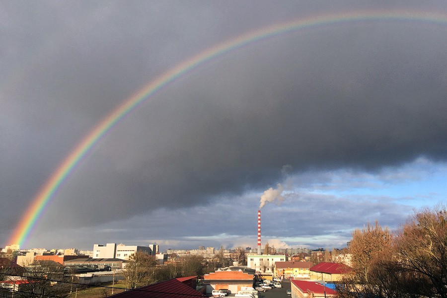 В небе над Калининградом днем 25 декабря можно было наблюдать радугу. Это оптическое атмосферное явление возникает при освещении ярким источником света (в природе — Солнцем) множества водяных капель в воздухе.