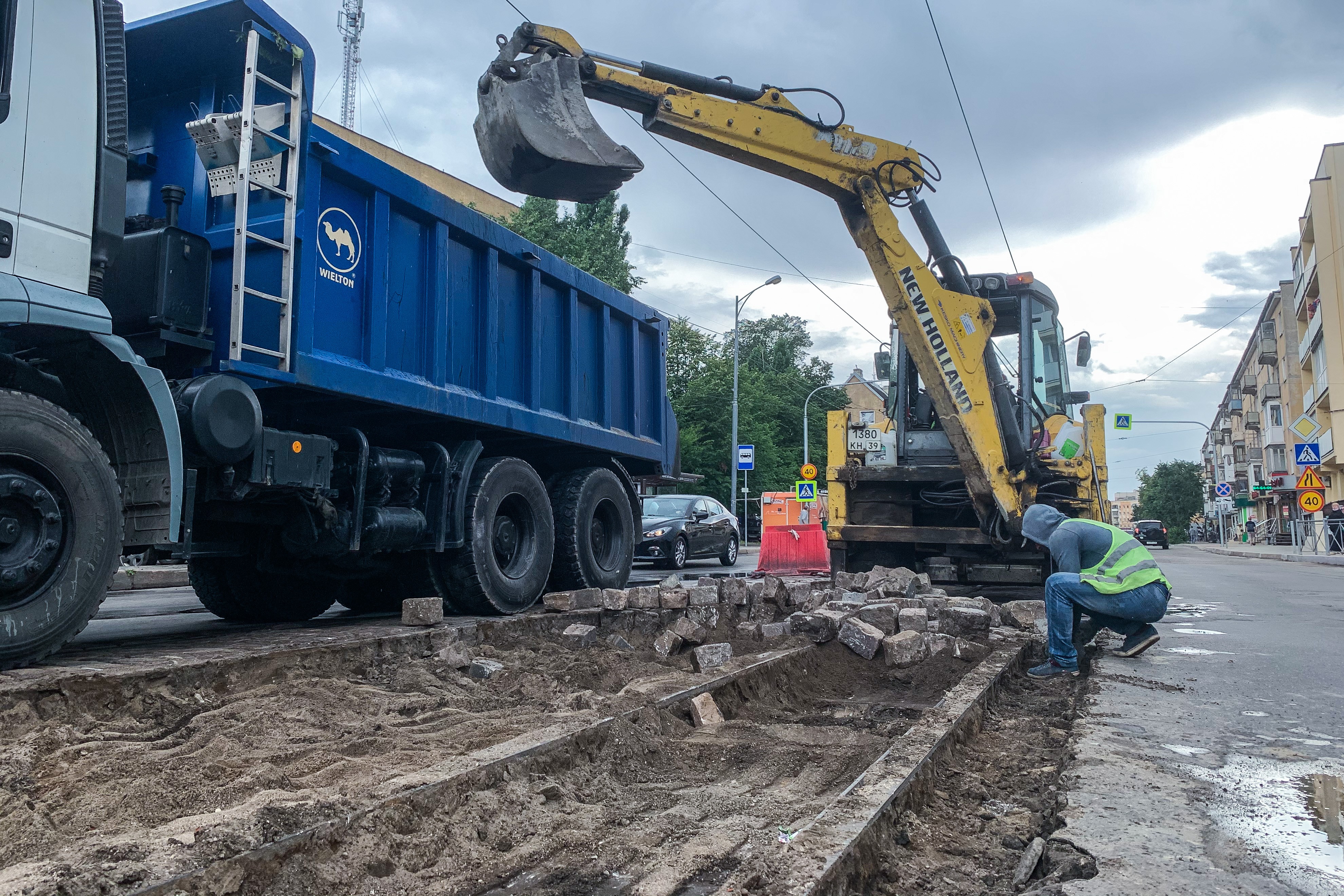 20 июля 2020 года. На ул. Багратиона с трамвайных рельсов убирают старую немецкую брусчатку. На место её не вернут, взамен планируется уложить плитку.