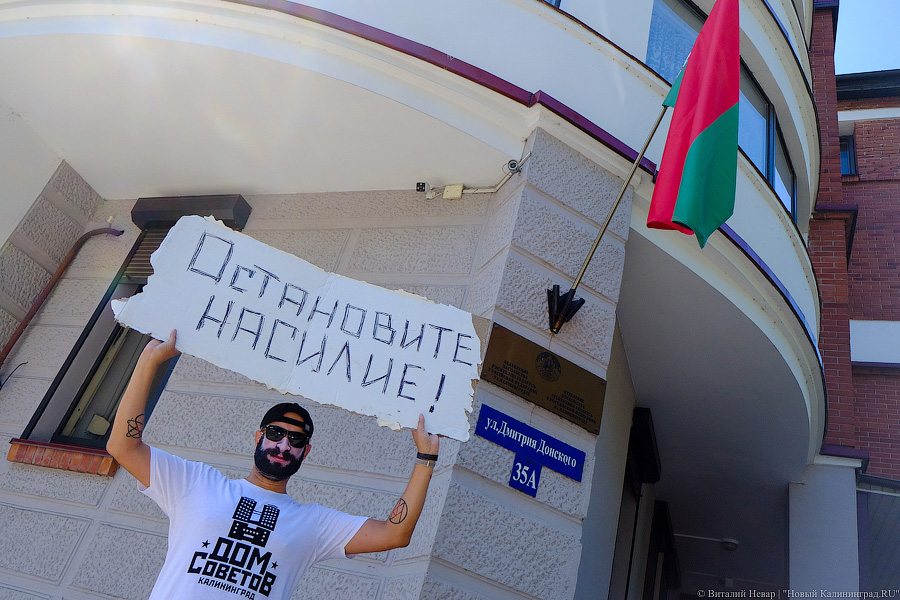 Калининградец Денис Оснач вышел с одиночным пикетом к зданию консульства Белоруссии. На плакате в его руках — призыв остановить насилие в стране.