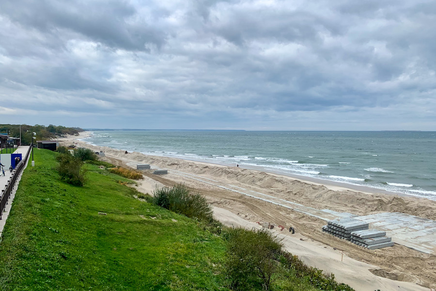 На западной части побережья в Зеленоградске идёт реконструкция берегозащитных сооружений. Работы ведутся от места, где велодорожка пересекается с дорогой к кемпингу, до спасательного поста в районе кафе «У Нептуна».