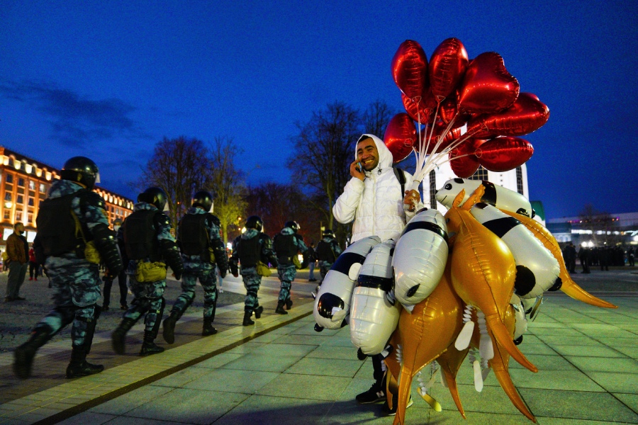 Среди людей, собравшихся сегодня вечером на площади Победы в Калининграде, были не только устроившие не санкционированную властями акцию сторонники оппозиционера Алексея Навального, их противники и многочисленные представители силовых структур. Один из калининградцев, например, пытался продавать в толпе воздушные шары.