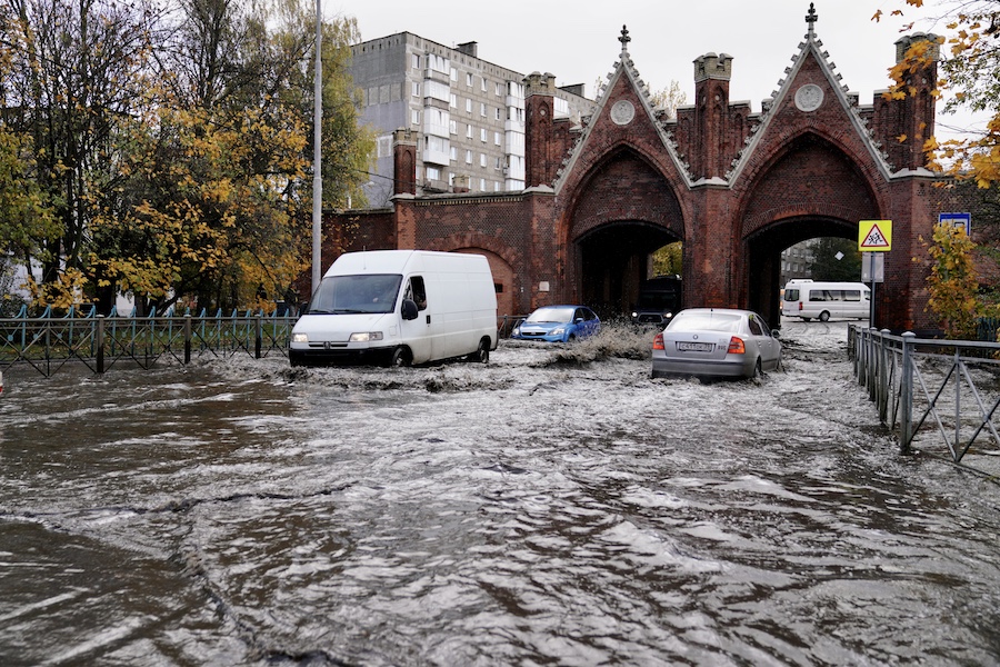 23 октября 2021 года. В городе всю ночь бушевали гроза и сильный ливень с градом. С утра улицы Калининграда оказались затоплены. Ливнёвки не справились с потопом даже к обеду.