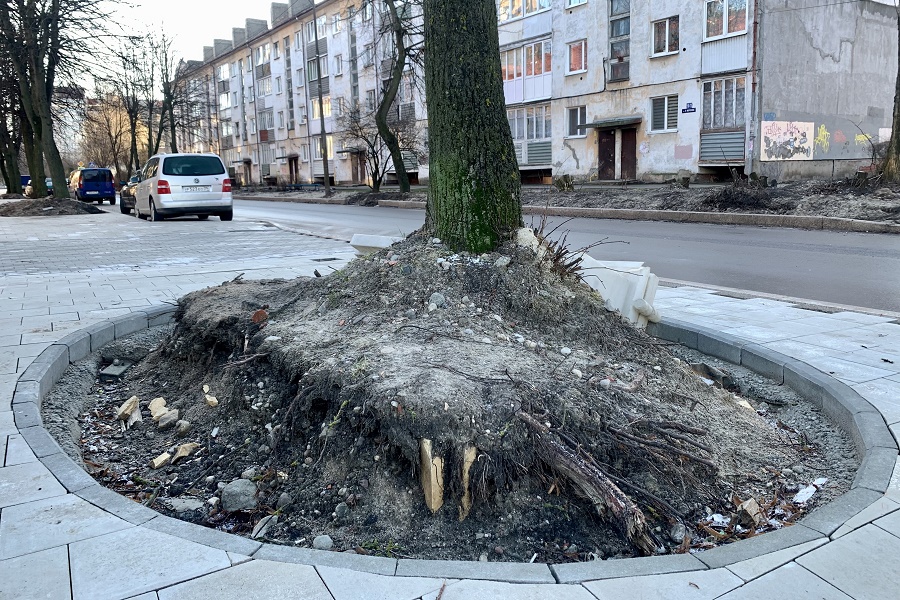 12 февраля 2022 года: на ул. П. Морозова, где проходит реконструкция, в ходе благоустройства обрубают корни у придорожных деревьев. Перед началом работ власти