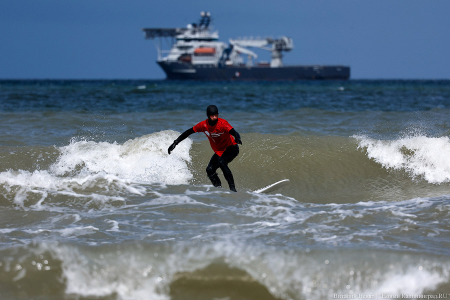 На западном побережье Зеленоградска проходит чемпионат Калининградской области по сёрфингу. Спортсмены соревнуются в дисциплинах «короткая доска» и «длинная доска». Поймать им сегодня удалось не только волну, но и проливной дождь. Лето близко, но это пока ещё мало заметно. Температура воздуха — всего 13 градусов, а воды, по данным сайта Seatemperature, — 11.