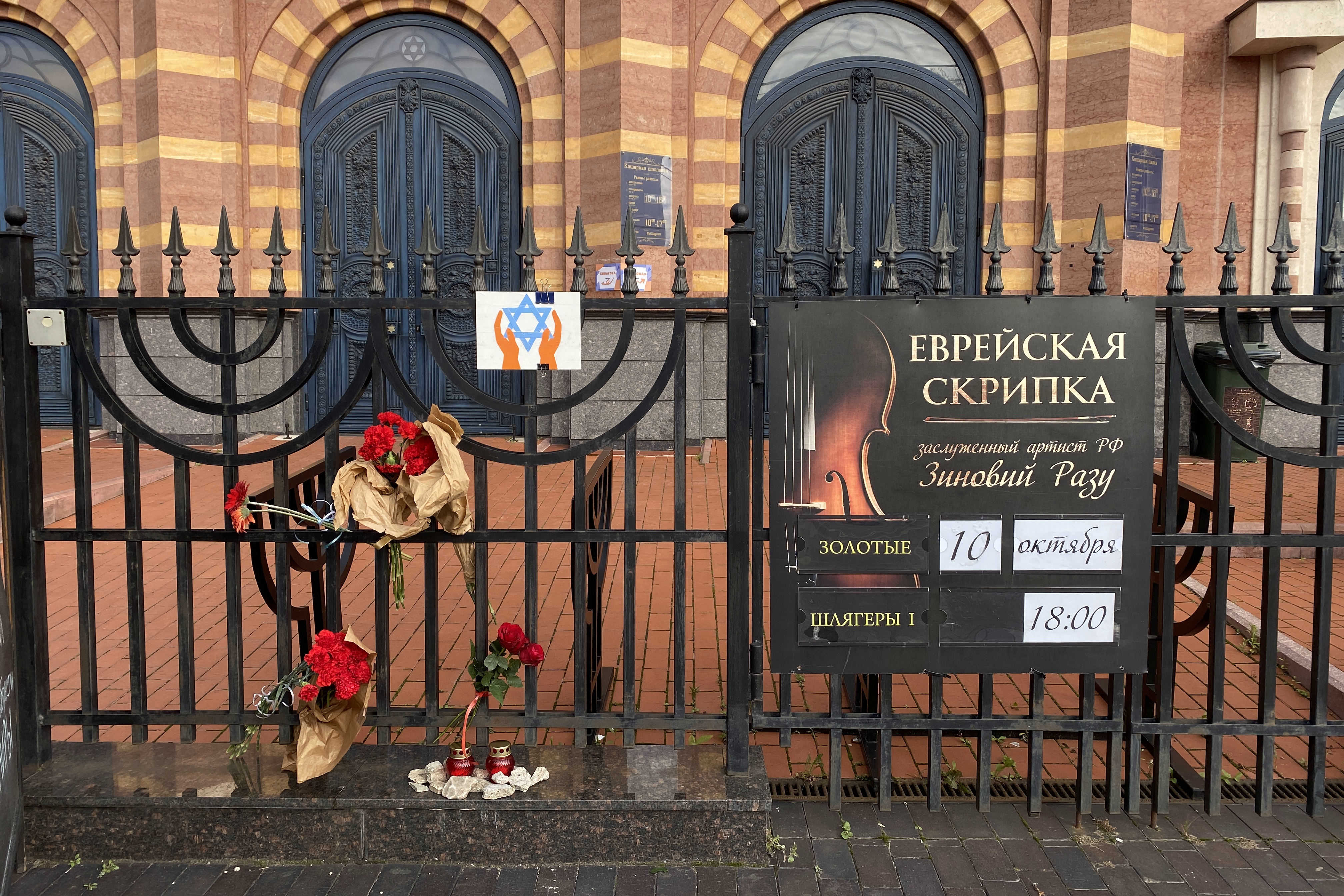 Калининградцы несут цветы и лампадки к Новой синагоге на Октябрьском острове. В субботу, 7 октября, движение «Хамас», контролирующее сектор Газа