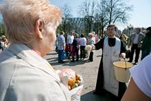 19 апреля 2014 года: калининградцы накануне праздника Пасхи пришли к храму Христа Спасителя, чтобы освятить куличи и яйца.