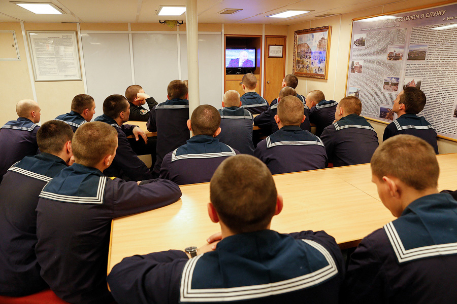 16 апреля 2015 года: военнослужащие по призыву СКР «Стойкий» смотрят прямую линию с президентом Владимиром Путиным.
