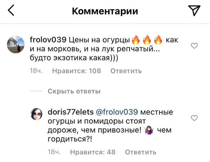 Беспокойство местных жителей по поводу резкого роста цен попытался развеять в своём «Инстаграме»* губернатор Антон Алиханов. Как сообщает РБК Калининград, глава региона опубликовал пост, посвящённый подорожанию моркови, пояснив, что закончилась как местная, так и белорусская продукция. В магазинах сейчас продают товар из Сербии, Израиля и Краснодарского края. Если через неделю в область поступит турецкая морковь, то розничные цены, как пояснил губернатор, снизятся с нынешних 140-160 рублей за килограмм до 100 рублей. Однако впоследствии пост из «Инстаграма»* Алиханова исчез, подписчики же продолжают задавать вопросы.
