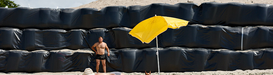 Возле Западного форта на Балтийской косе идут работы по восстановлению авандюны. Они слегка подпортили лето отдыхающим, но больше всего вопросов к «берегозащите» на косе возникло у экологов и местных жителей. Чтобы укрепить берег в районе форта, рабочие сгребают песок прямо с пляжа, дополнительно разбивая его тяжелой техникой. Потом песок ссыпают в мешки и составляют из них защитную стенку. Экологи считают такое укрепление недолговечным и опасным для природы. Власти говорят, что это противоаварийные работы и они необходимы, а «нормальное» берегоукрепление на косе тоже будет. Когда-нибудь, когда появятся деньги. Доживет ли до светлого будущего Западный форт, признанный объектом культурного наследия — еще большой вопрос. На самом постапокалиптическом пляже области побывали корреспонденты «Нового Калининграда».