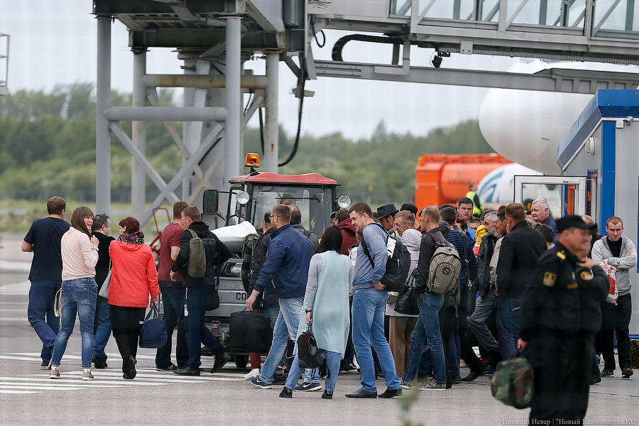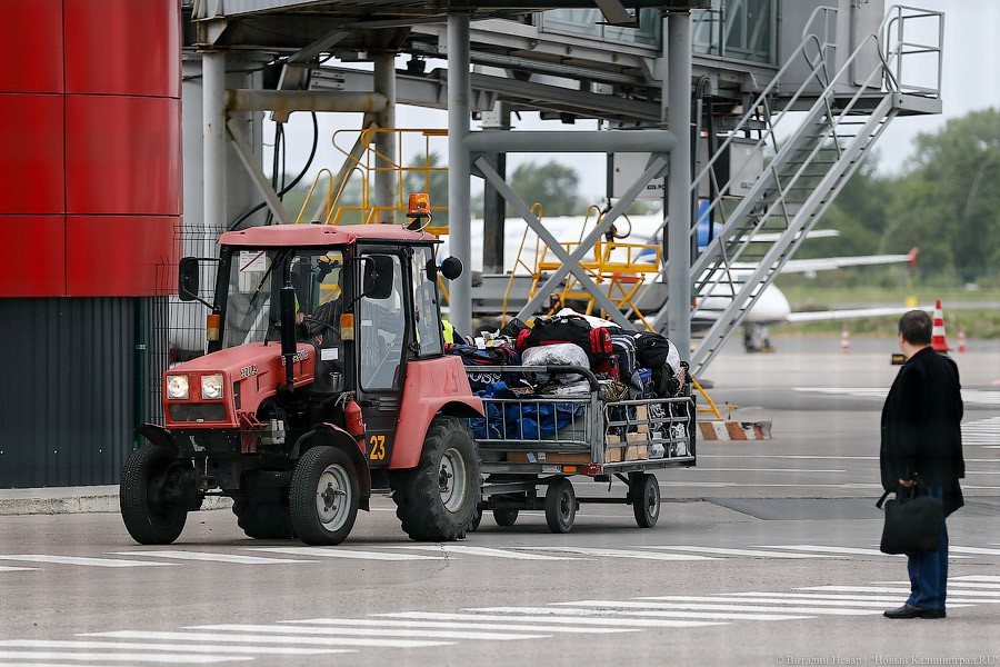 На летном поле разворачивается уже знакомый калининградцам аттракцион — к покинувшим лайнер пассажирам подъезжают тележки с багажом. Людям предлагается разобрать свои сумки и чемоданы прямо под телескопическими трапами. Заметившие, наконец, фотографа «Нового Калининграда.Ru» сотрудники «Храброво» пытаются пресечь несанкционированную съемку секретной багажной спецоперации.