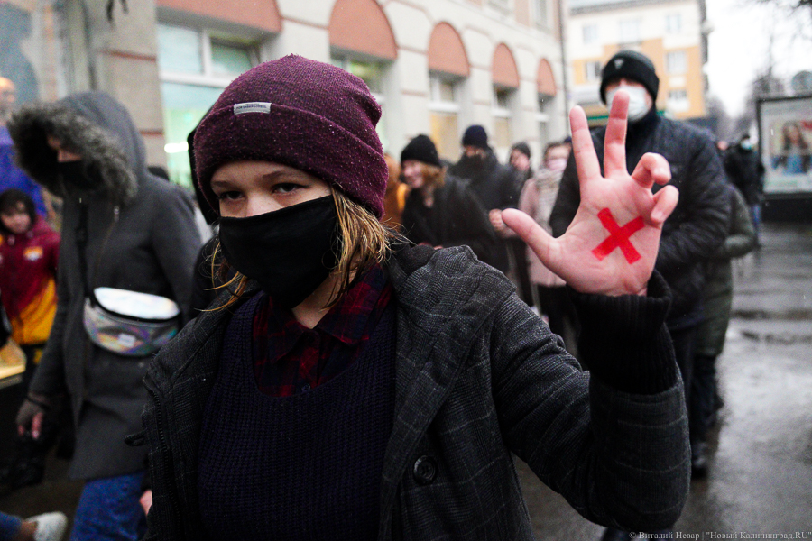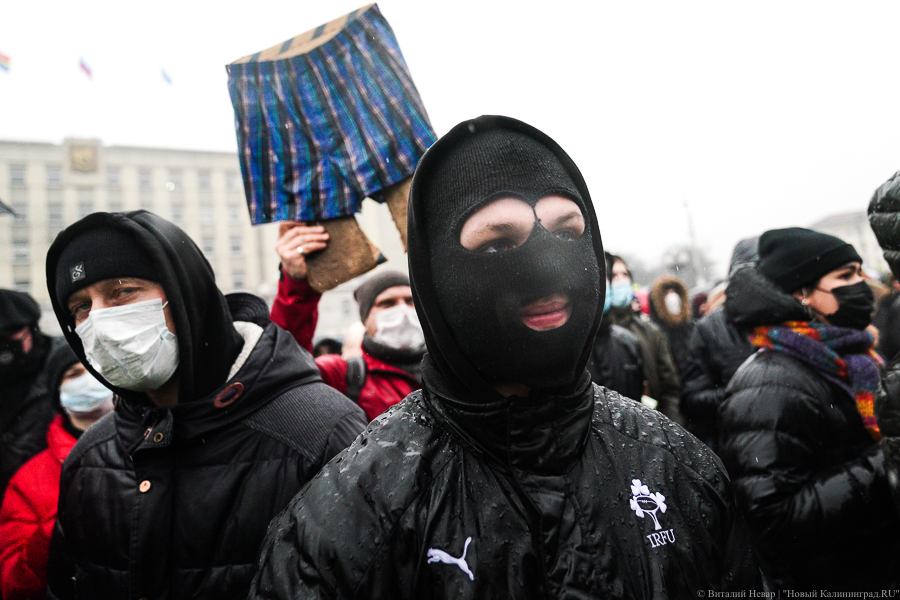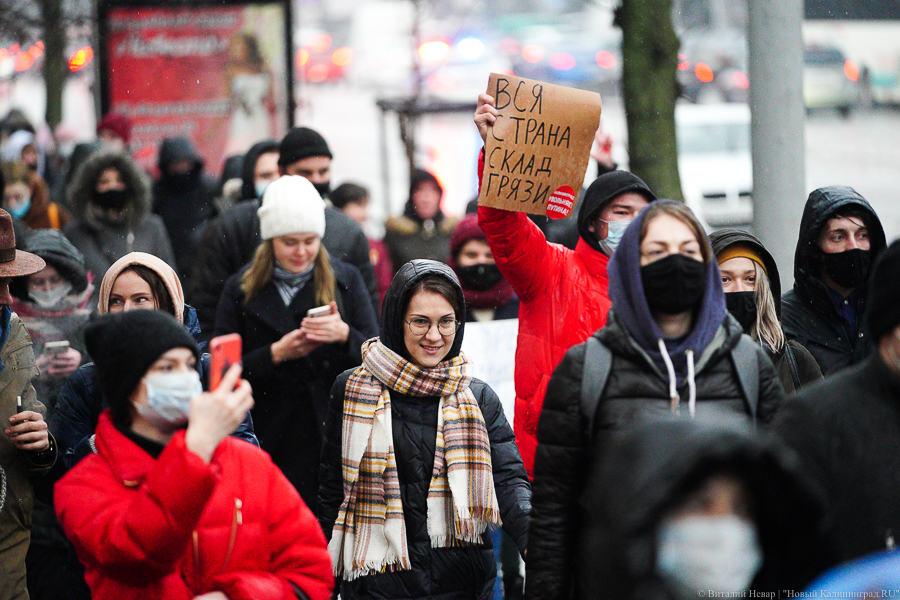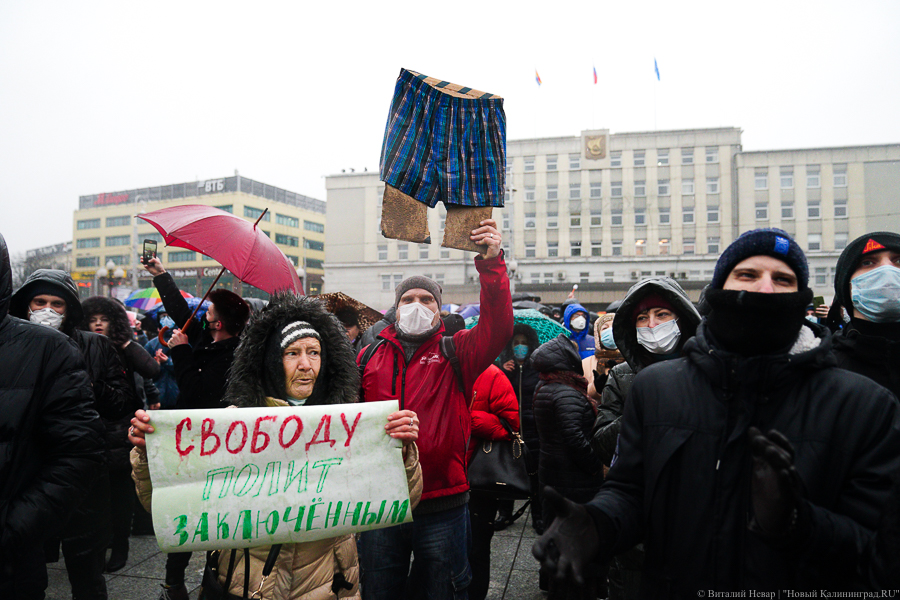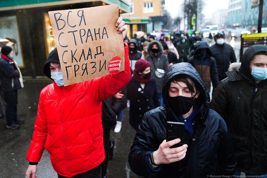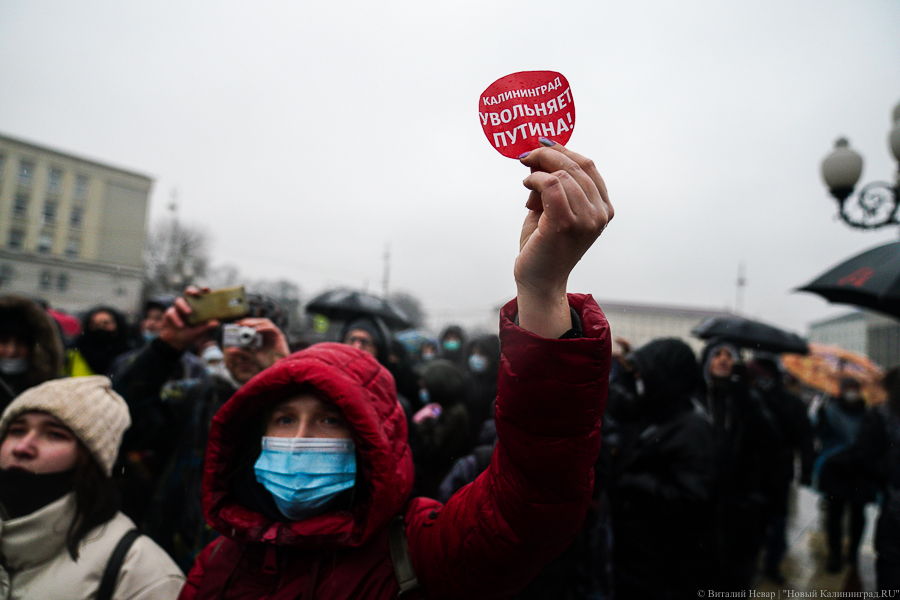 В субботу, 23 января, сторонники оппозиционера Алексея Навального в Калининграде, как и в ряде других городов, вышли на акцию в поддержку политика. Участники собрались у Дома Советов, откуда проследовали к площади Победы, скандируя «Россия без Путина», «Раз, два, три — Путин, уходи», «Выпускай». У Триумфальной колонны, где к этому времени несколько противников несогласованных мероприятий устроили одиночные пикеты, к ним присоединились другие митингующие. По оценкам корреспондентов «Нового Калининграда», в общей сложности в акции приняло участие порядка трёх тысяч человек. Правоохранители, под чьим пристальным вниманием проходили шествие и митинг, задержали несколько протестующих. За происходящим наблюдал фотокорреспондент «Нового Калининграда» Виталий Невар.