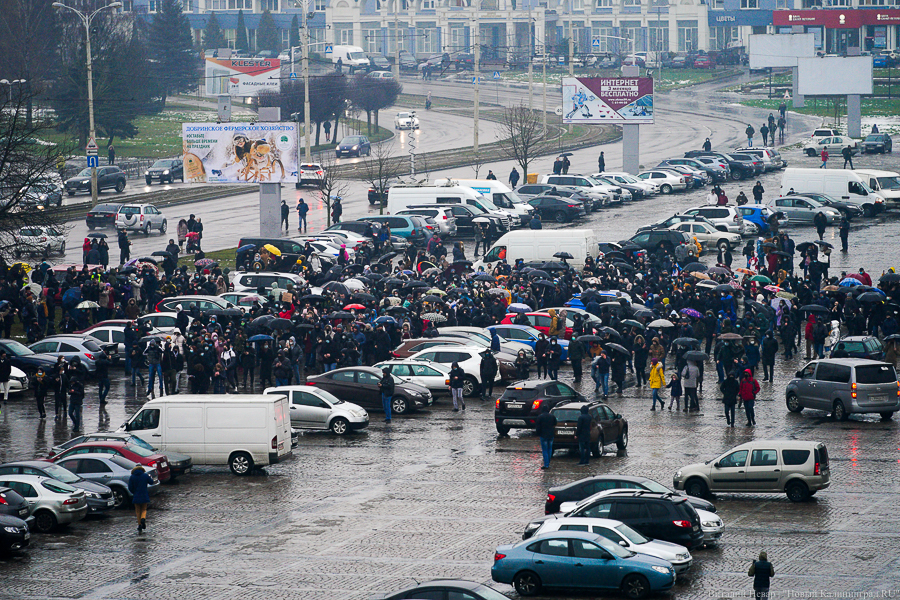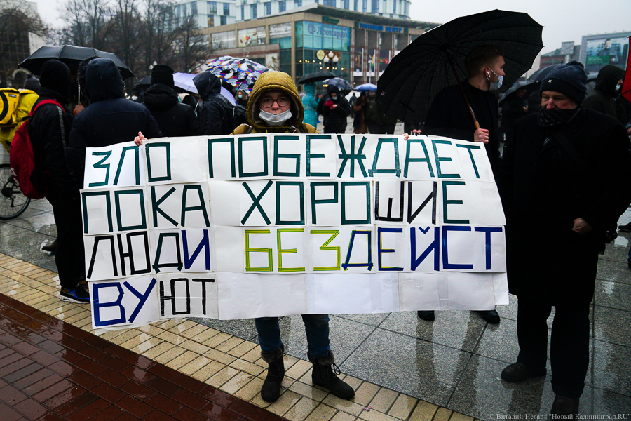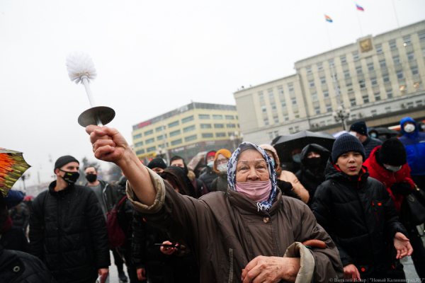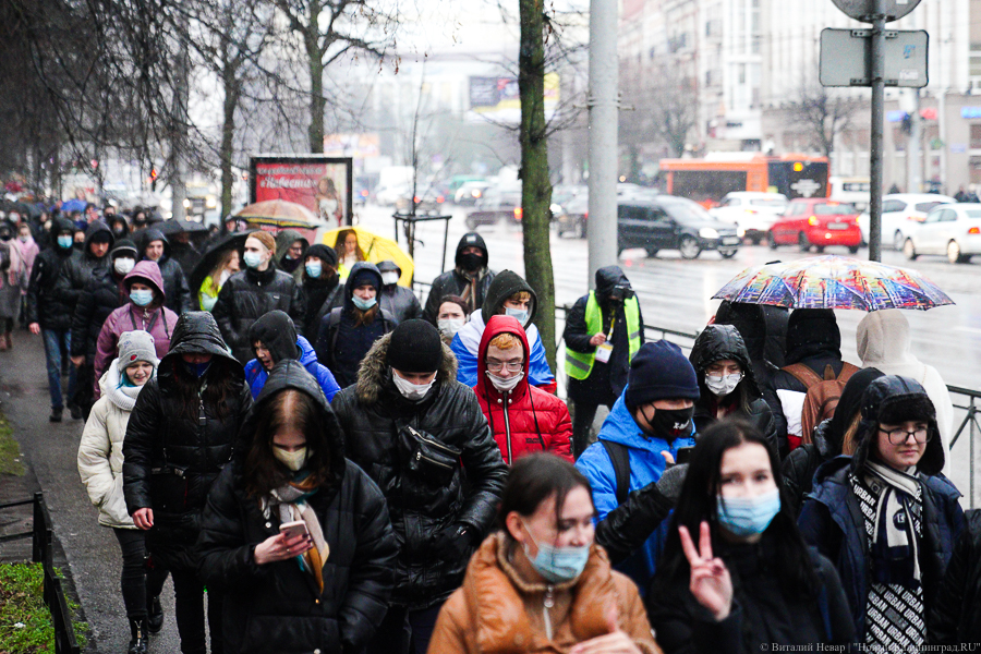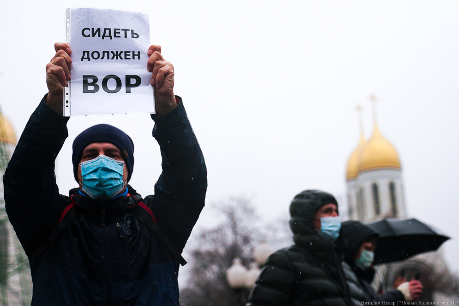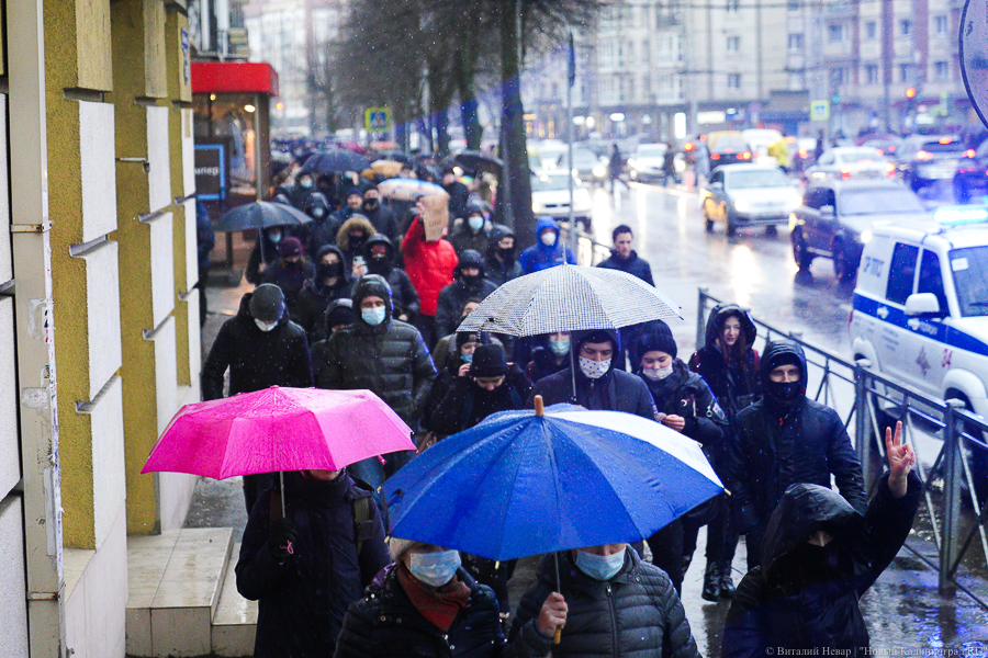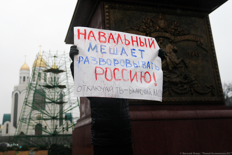 В субботу, 23 января, сторонники оппозиционера Алексея Навального в Калининграде, как и в ряде других городов, вышли на акцию в поддержку политика. Участники собрались у Дома Советов, откуда проследовали к площади Победы, скандируя «Россия без Путина», «Раз, два, три — Путин, уходи», «Выпускай». У Триумфальной колонны, где к этому времени несколько противников несогласованных мероприятий устроили одиночные пикеты, к ним присоединились другие митингующие. По оценкам корреспондентов «Нового Калининграда», в общей сложности в акции приняло участие порядка трёх тысяч человек. Правоохранители, под чьим пристальным вниманием проходили шествие и митинг, задержали несколько протестующих. За происходящим наблюдал фотокорреспондент «Нового Калининграда» Виталий Невар.