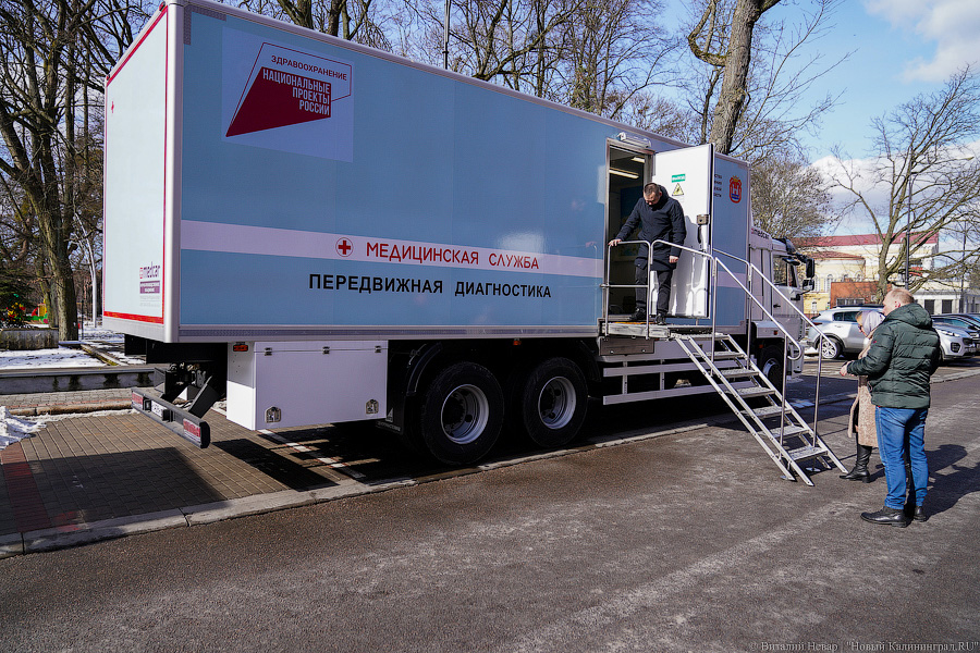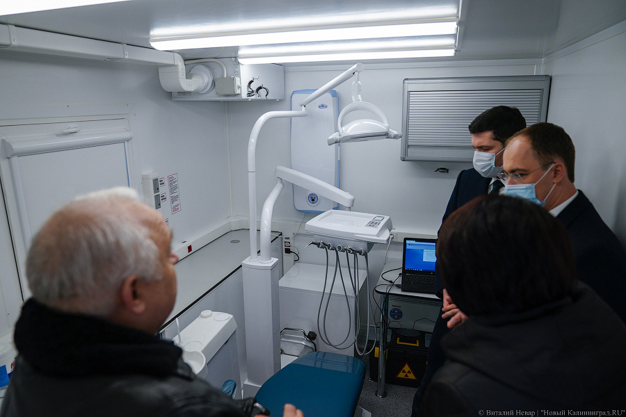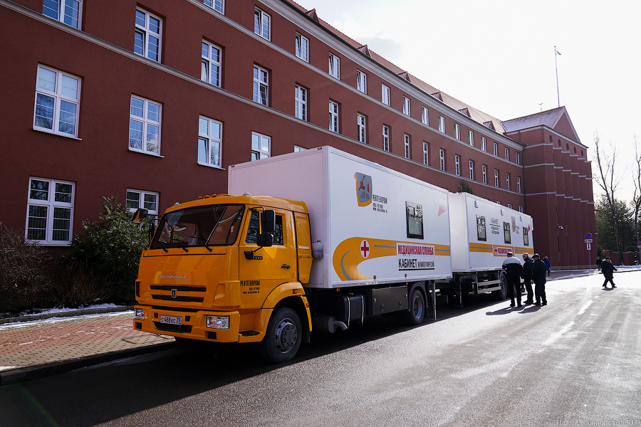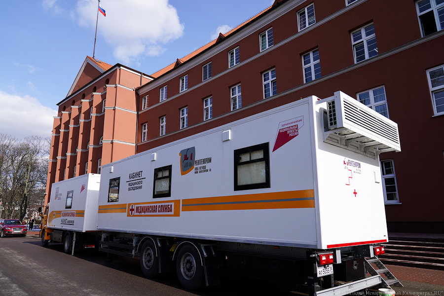 Советская стоматологическая поликлиника получила передвижной кабинет с лечебным и диагностическим оборудованием. Центр оснащён стоматологической установкой, рентгеновским аппаратом и цифровым дентальным радиовизиографом. Для Черняховской ЦРБ приобрели маммографический кабинет. «Это современный маммографический аппарат с плоскопанельным детектором с очень высоким разрешением. <...> И, соответственно, прицеп — это три медицинских кабинета, которые могут укомплектовываться в зависимости от задач, которые в текущий момент этот центр будет решать. Сценариев достаточно много — от гинекологических кабинетов до центров здоровья, которые могут выезжать», — отметил Кравченко. Планируется, что передвижной маммограф будет обслуживать по графику население сельских территорий Черняховского и соседних муниципалитетов.