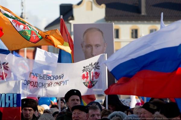 В пятницу в пять часов вечера в центре Калининграда, на площади Победы состоялся уже традиционный, третий по счёту митинг в честь присоединения Крыма к Российской Федерации. По оценкам полиции, на площади собрались аж 12 тысяч человек, оценки «Нового Калининграда.Ru» значительно скромнее — не более 4-5 тысяч человек. Как всегда, значительную часть митингующих составляли сотрудники муниципальных структур и студенты вузов, а также казаки. Как всегда, руководители области и города проигнорировали этот пик народного единения. Со сцены звучали патриотические лозунги, перемежавшиеся выступлениями народных коллективов, а над головами собравшихся назидательно смотрел с портрета президент России Владимир Путин. Председатель Калининградского областного Совета ветеранов провозгласил: «За Путина! За Родину! За Крым! Победа будет за нами!». А затем пошёл снег, наступило 6 часов вечера, рабочий день муниципалов закончился, и они понемногу потянулись под пронизывающим ветром в сторону своих домов.