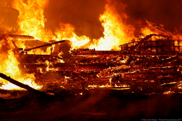 Вечером в четверг на проспекте Калинина в областном центре произошел крупный пожар. Около 18:00 загорелись складские помещения у торгового центра «Калининский». Сначала площадь возгорания составила около 100 квадратных метров, но потом пламя разрослось и уничтожило большую часть здания. Начал взрываться шифер, огонь стал перекидываться с мебельного склада на другие строения. С огнем боролись сначала 16 человек, потом 38; в итоге их число выросло до 42. Лишь через полтора часа его удалось локализовать — то есть остановить распространение пожара. За эпическим зрелищем, которое, увы, явно принесло большие убытки местным предпринимателям, наблюдал фотокорреспондент «Нового Калининграда.Ru»