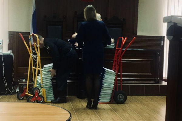 Когда они закончили перемещать мебель, в зал заседаний завезли материалы уголовного дела. Именно завезли — томов было так много (по словам одного из адвокатов, чуть больше 40), что их пришлось погрузить на специальные тележки. Разделенные на несколько стопок документы заняли почти весь стол судьи Сергея Капранова.