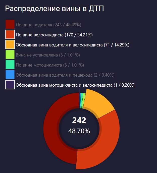 За минувшие пять лет в Калининградской области в ДТП пострадали 438 велосипедистов. Только в 2020 году в регионе было зафиксировано 68 таких происшествий, причем шестеро пострадавших велосипедистов скончались. Это, конечно, далеко не самый большой показатель по России, но отнюдь и не самый благоприятный. По данным ГИБДД на апрель 2021 года, в регионе в 63% случаев виновным в ДТП признавался водитель автомобиля, в 34% — велосипедист, в 14,4% — устанавливается обоюдная вина. К сентябрю 2021 года Госавтоинспекция обновила данные: статистика изменилась не в пользу велосипедистов — водителей виновными стали признавать гораздо реже (48,8%).