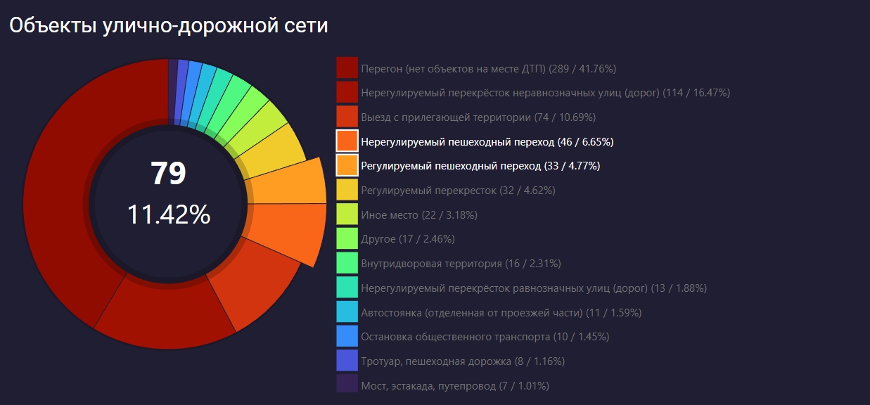 По данным на апрель 2021 года, примерно седьмая часть (15,5%) всех дорожных происшествий с велосипедистами происходили, когда те не спешившись пересекали пешеходный переход. При этом вина автомобилистов в ДТП с неправильным пересечением пешеходного перехода была установлена только в 7,8% случаев. В основном велосипедисты попадают в ДТП на внегородских автодорогах и перекрестках, а вот происшествия на пешеходных переходах — явление не самое частое.