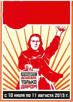 «Приходите! Дешевле только даром» — взывает реклама фирмы, на которой изображен образ плаката времен Великой Отечественной войны «