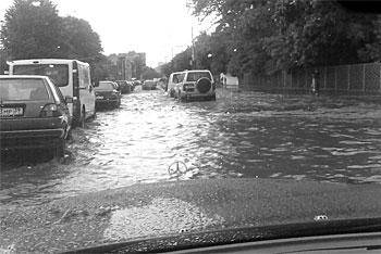 Например, выезд из гаража инкассаторской службы на Нарвской полностью перекрыт двадцатиметровой лужей, глубиной до полуметра. Уже собираются пробки на подтопленных участках улиц.