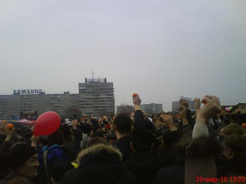 В 12.30 песней «Колечко мое» завершилось выступление неоригинального коллектива «Балаган лимитед» на площади Победы. Ведущий призвал «поприветствовать людей, исповедующий и проповедующих культуру России». Зрителей на этом мероприятии присутвует около 400 человек, их количество почти не меняется. На площади идет торговля сувенирами, куклами другой подобной продукцией.